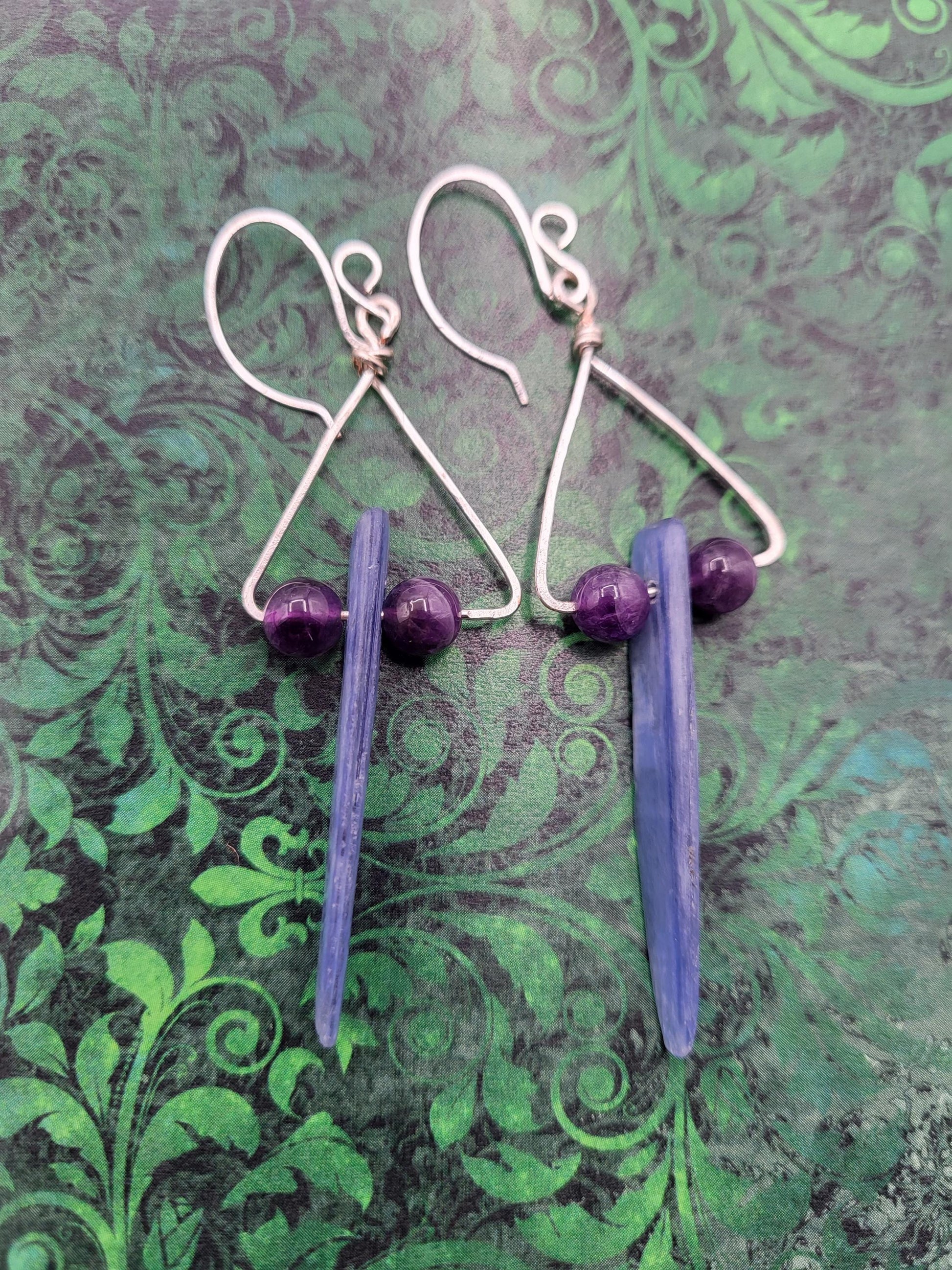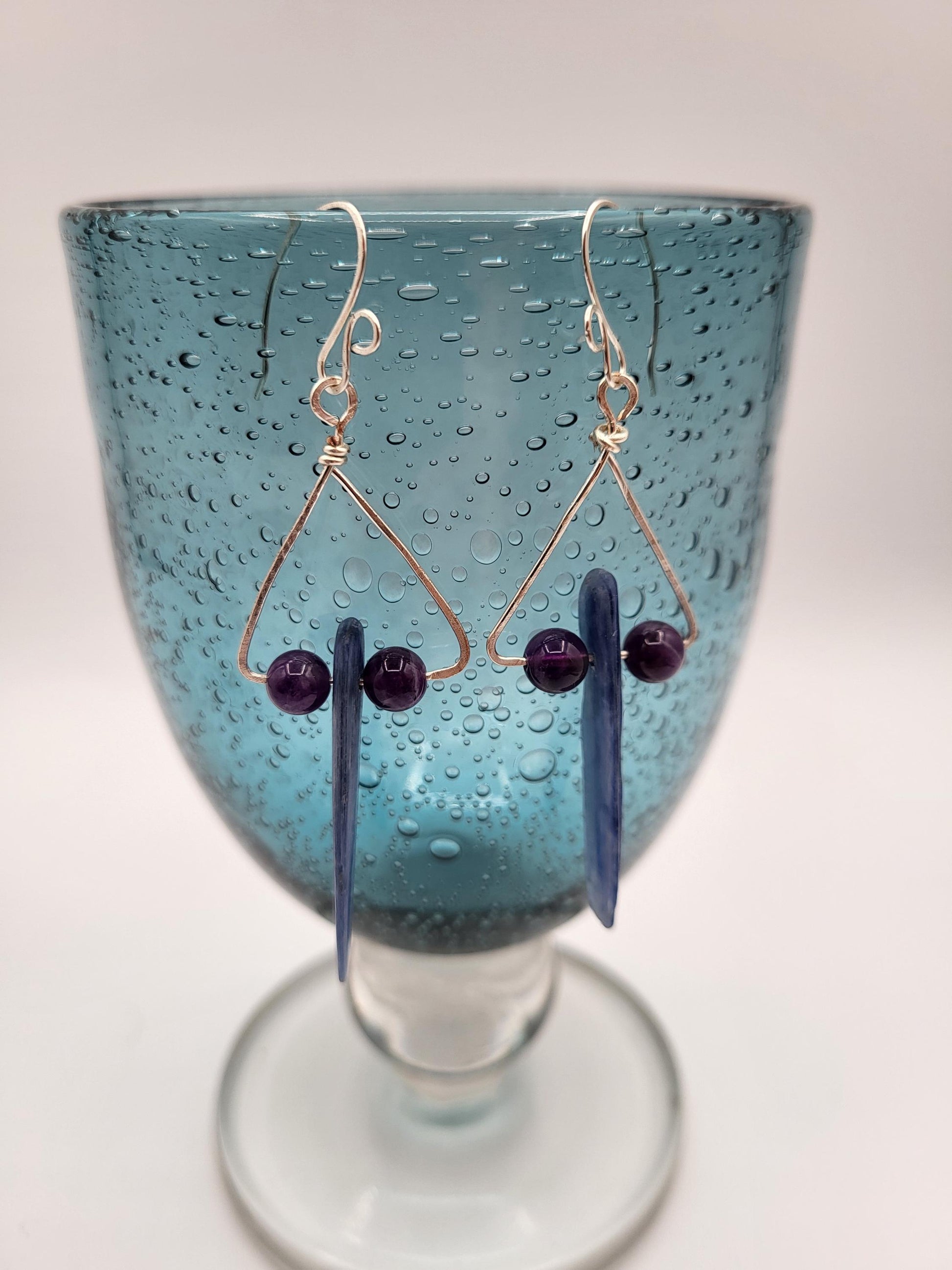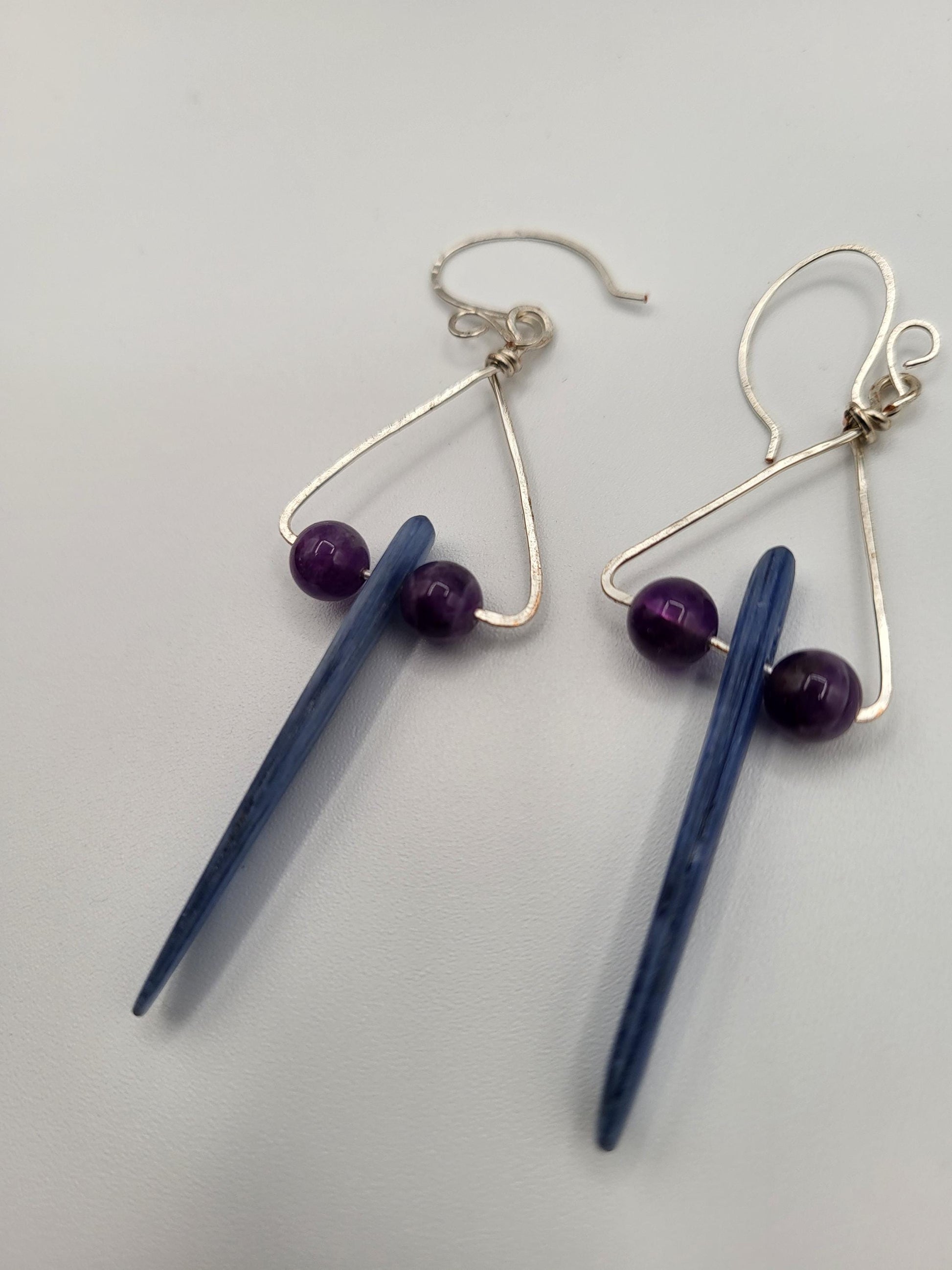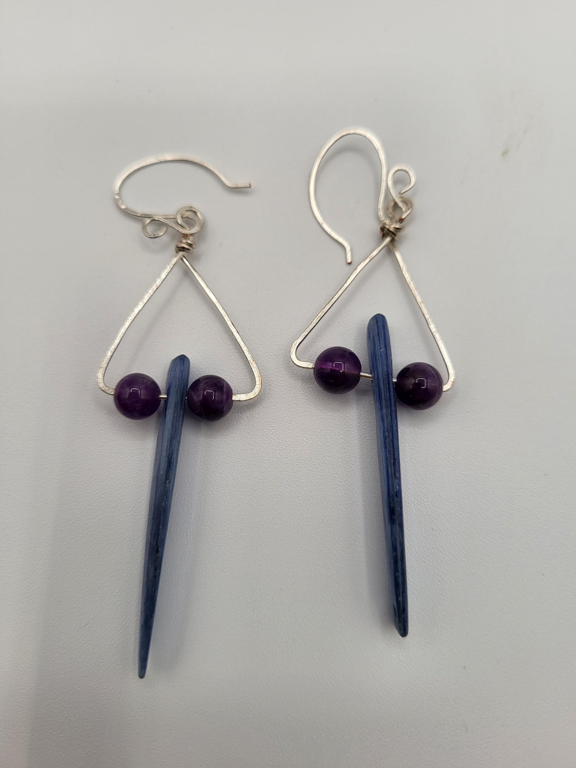 Delicate Kyanite and Amethyst beads suspended from triangle shapes made of silver wire.