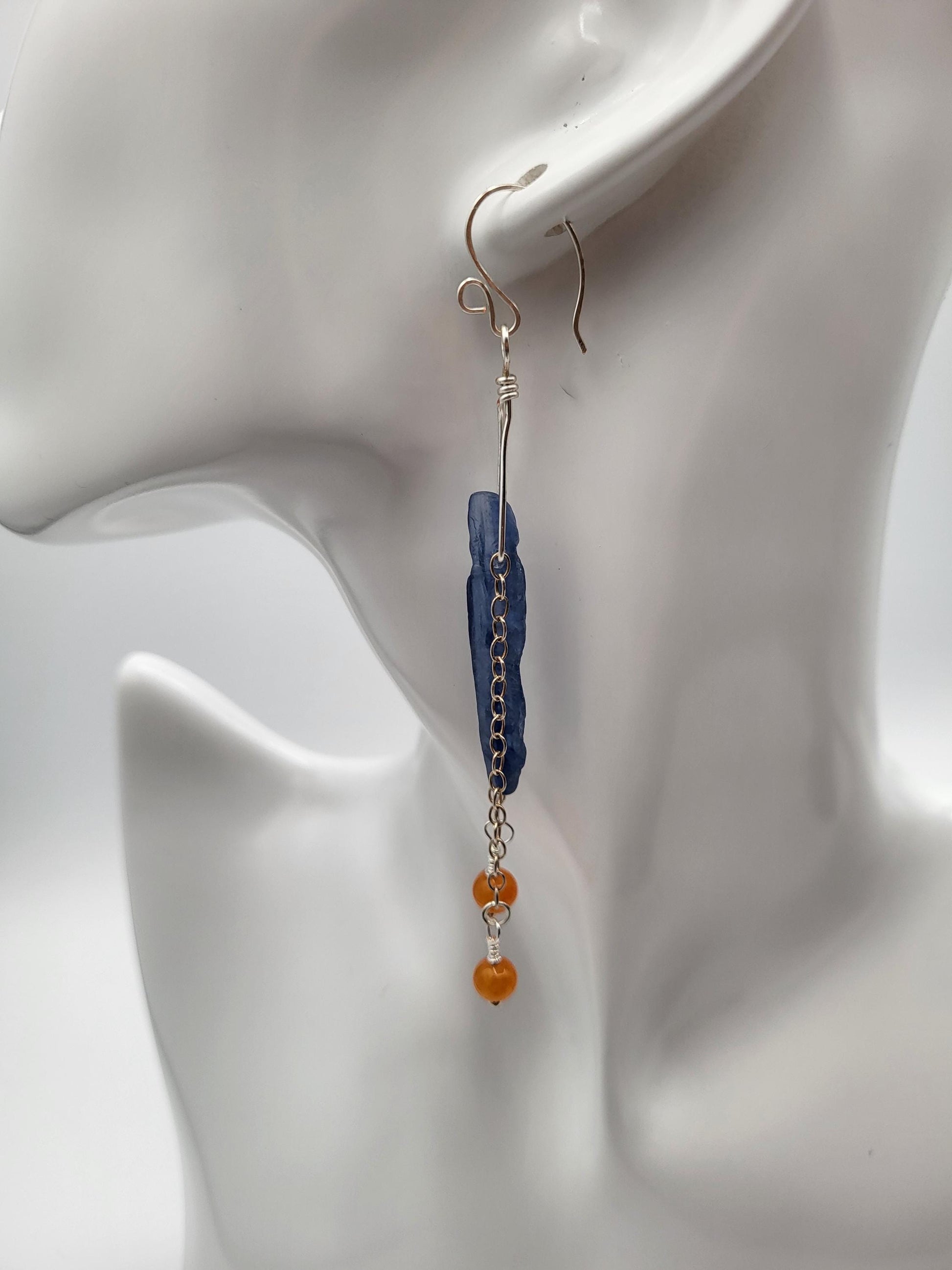 Delicate Kyanite and Carnelians suspended from silver chains and wire.