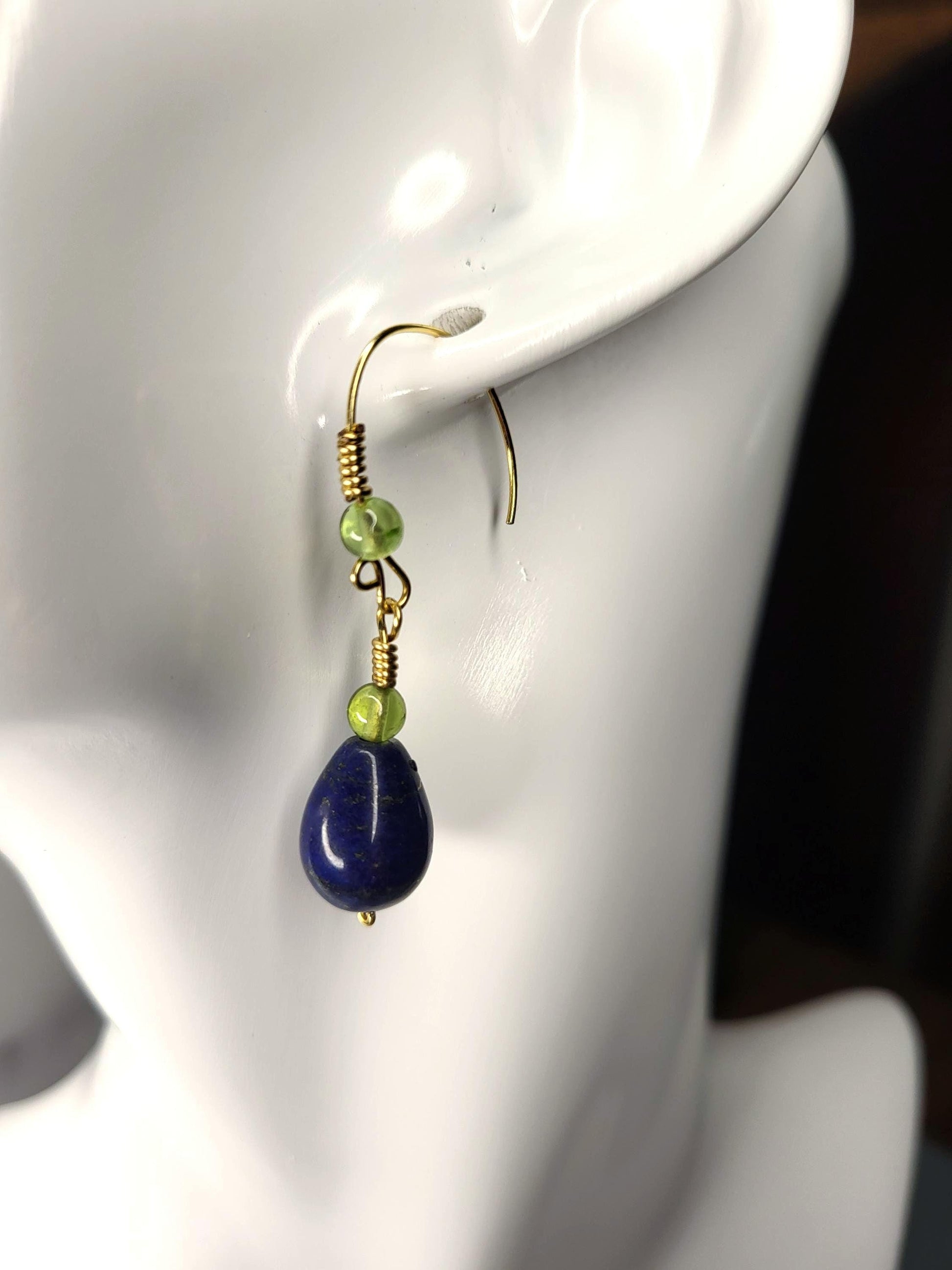 Very Elegant Lapis and Peridot Earrings. These are hand wrapped Lapis Lazuli Drops with a nice Peridot Bead on top, wrapped with Brass Wire. They are hung on a hand made gold ear wire with another Peridot Bead on top. Matching handmade ear wires!