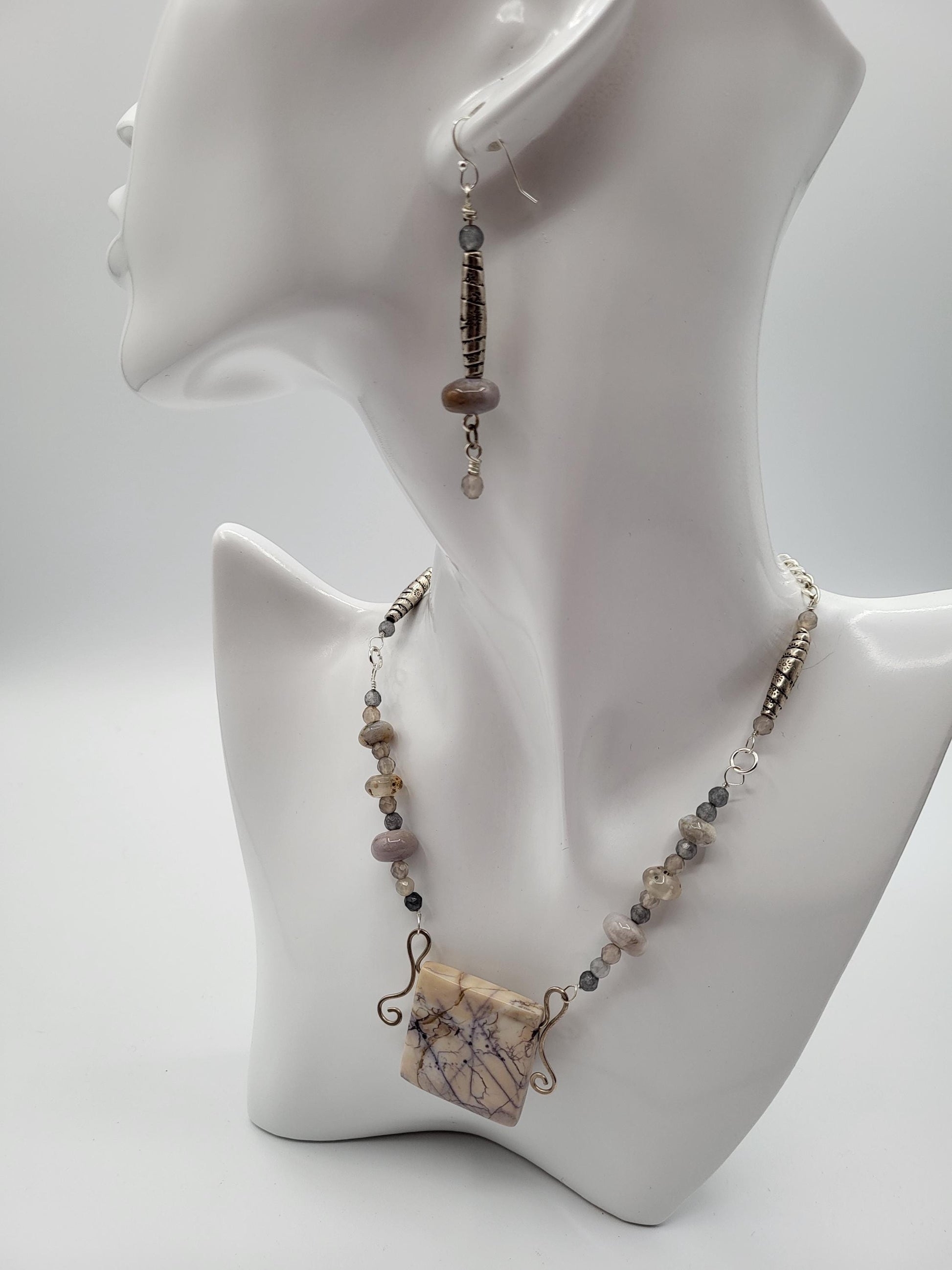 Hand hammered Silver framing a beautiful Lavender picture Jasper stone. Small various matching Jasper and Agate beads adorn the chain and earrings. Nuevo set.