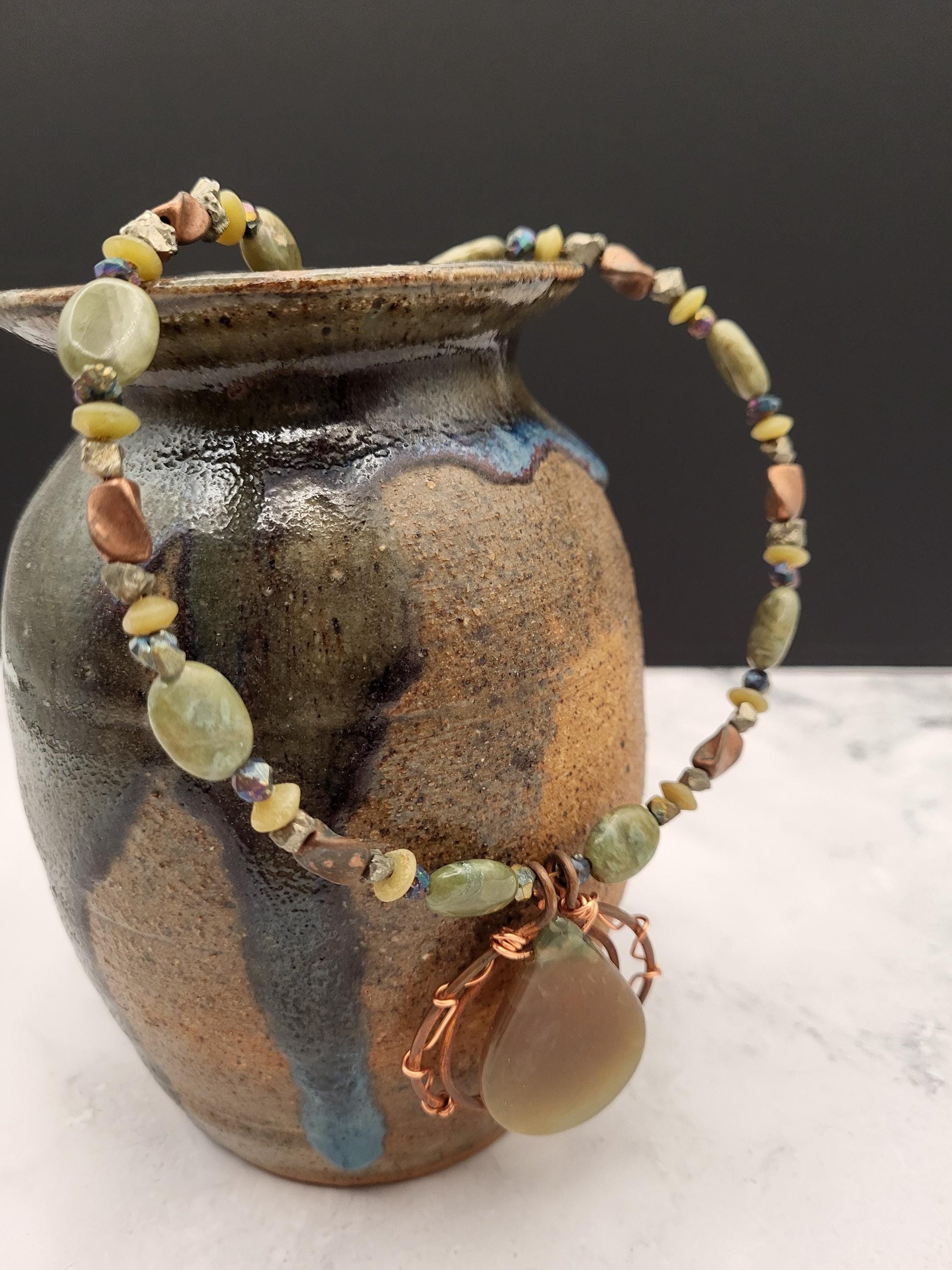 Clear moss agate stone wire wrapped by copper wire. Set among beautiful olive jasper ovals and jade spacer beads. Aged with a very nice patina gives this necklace a rustic look. Fantastic for casual wear!