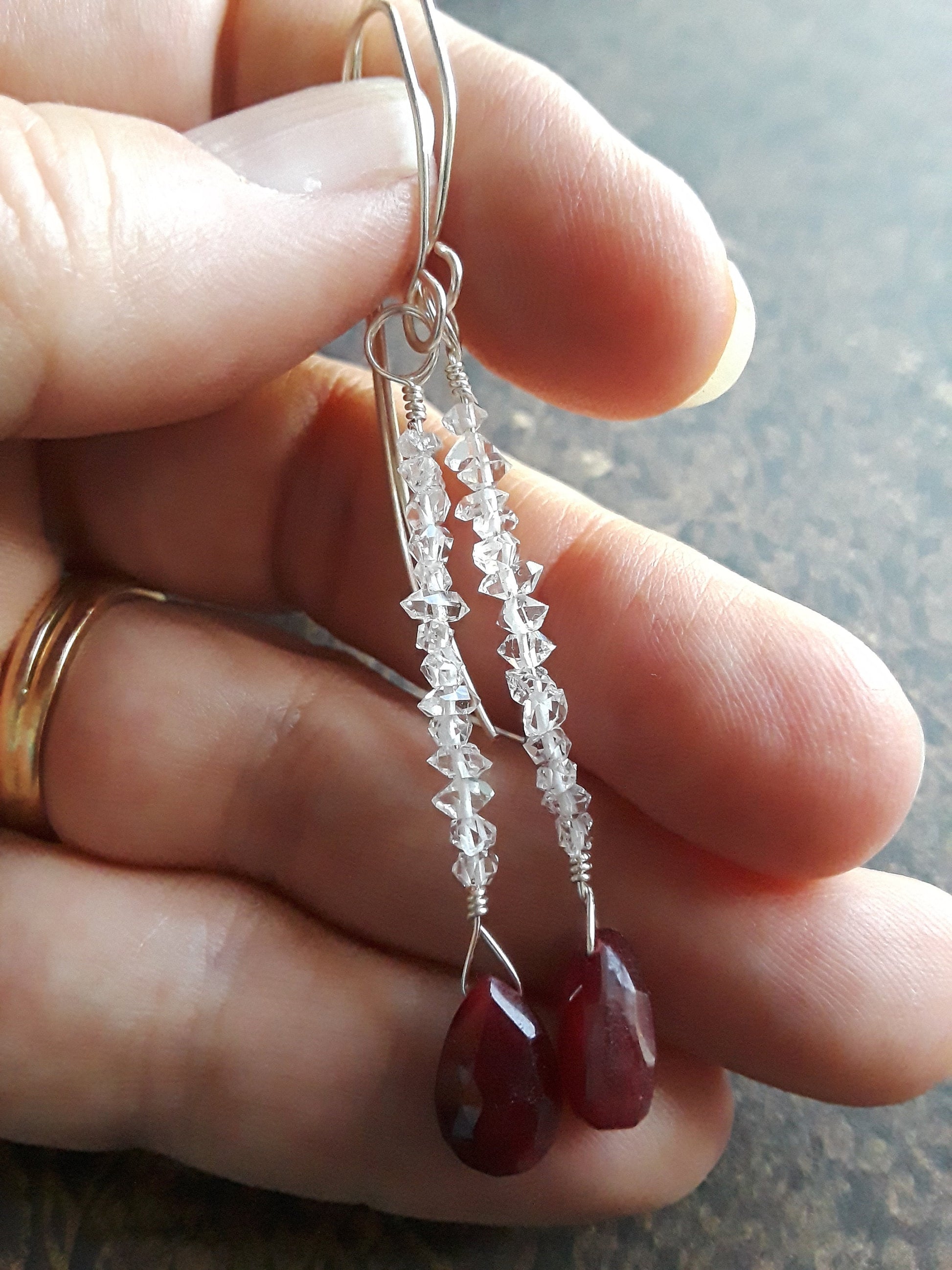 Genuine Natural Ruby Teardrops are suspended by a cascade of many shimmery Herkimer Diamonds.